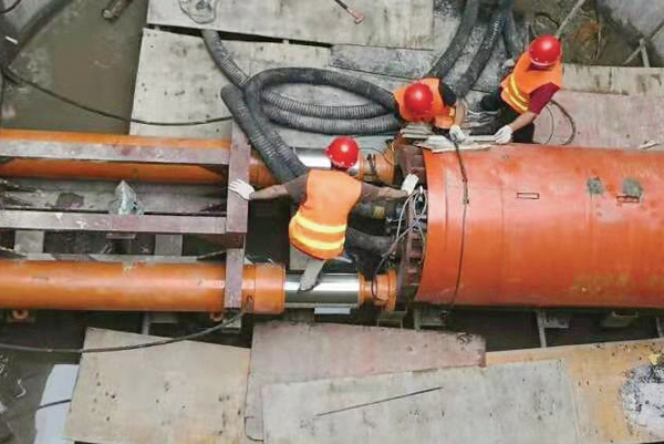 頂管機在液壓千斤頂助力下頂進時停止挖土,傳力柱上和兩